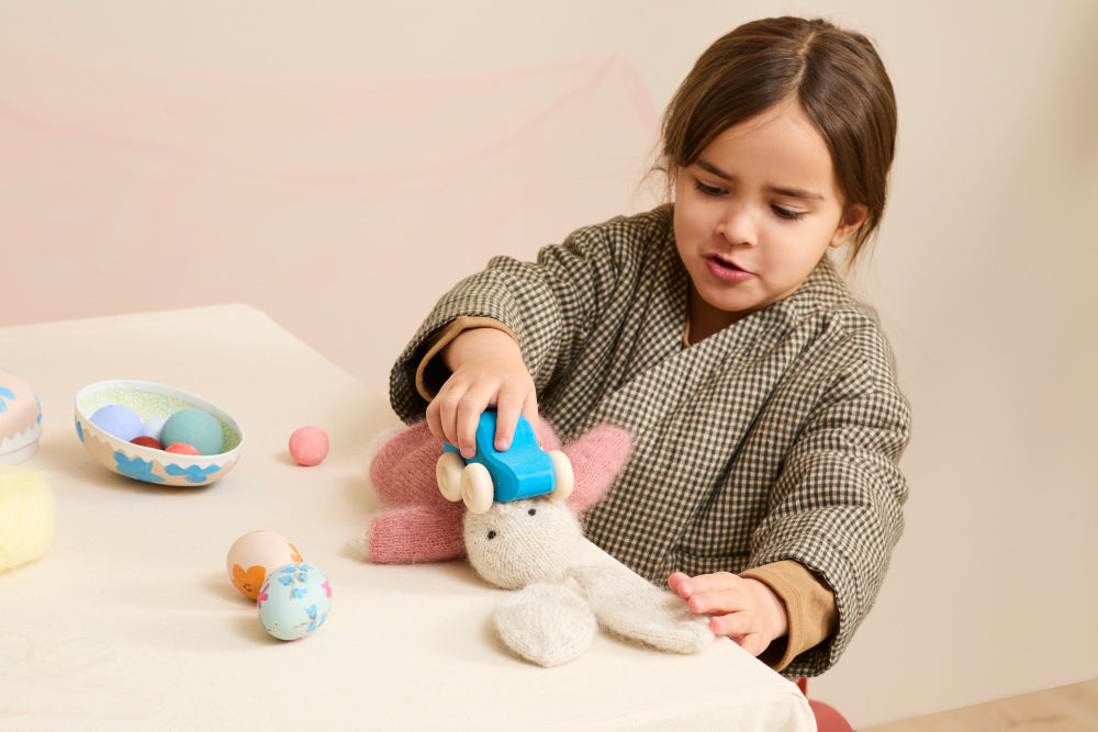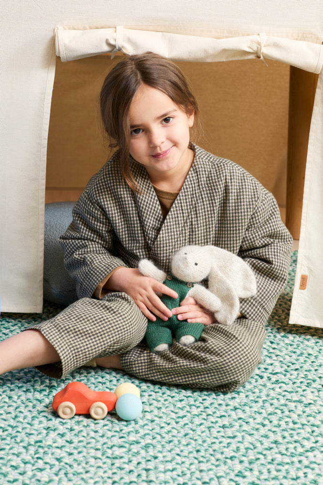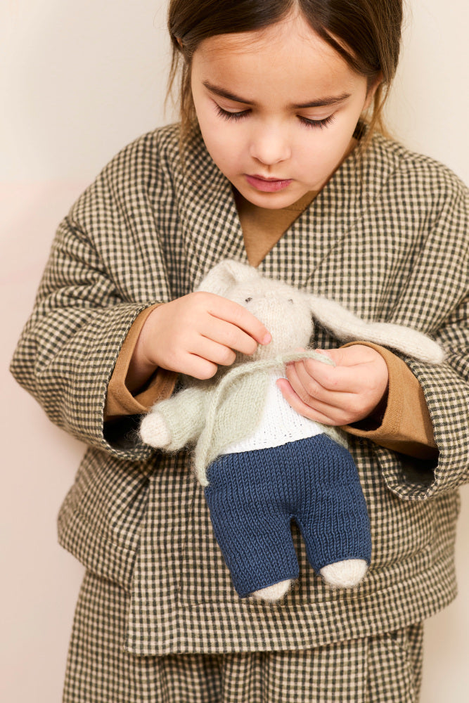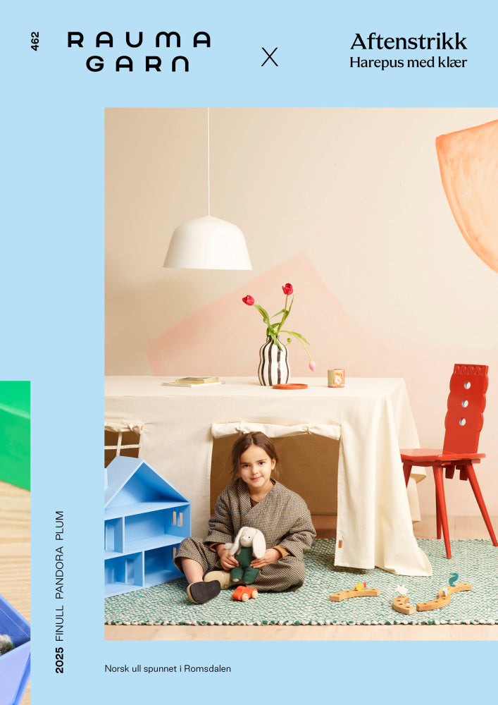 Alle otte opskrifter i dette hæfte strikkes i Finull, Plum og Pandora – garner, der skaber dybde, blødhed og lethed til harepus og dens garderobe. Harepus fyldes med uldflor, hvilket gør den blød nok til at være en god ven, men også stabil nok til at klare alle de eventyr, der venter fremover. Lad harepus og barnet udfolde sig kreativt med de forskellige dele af garderoben: en legesyg selebuks, den stilfulde bindetrøje, en farverig stribet jakke, den tidløse T-shirt, en behagelig kjole, det trendy sjal og det ikoniske Aftenstrikk minitæppe.