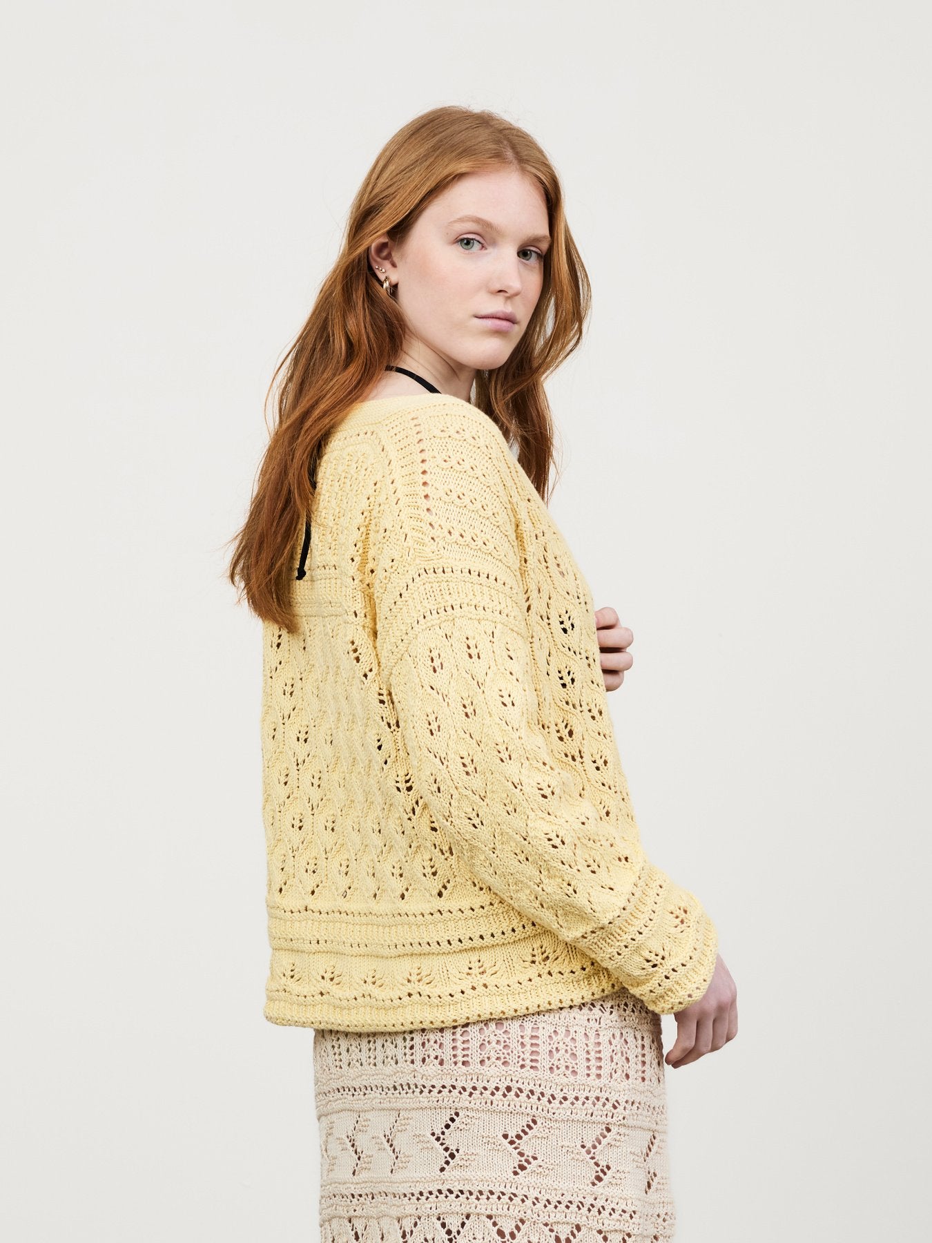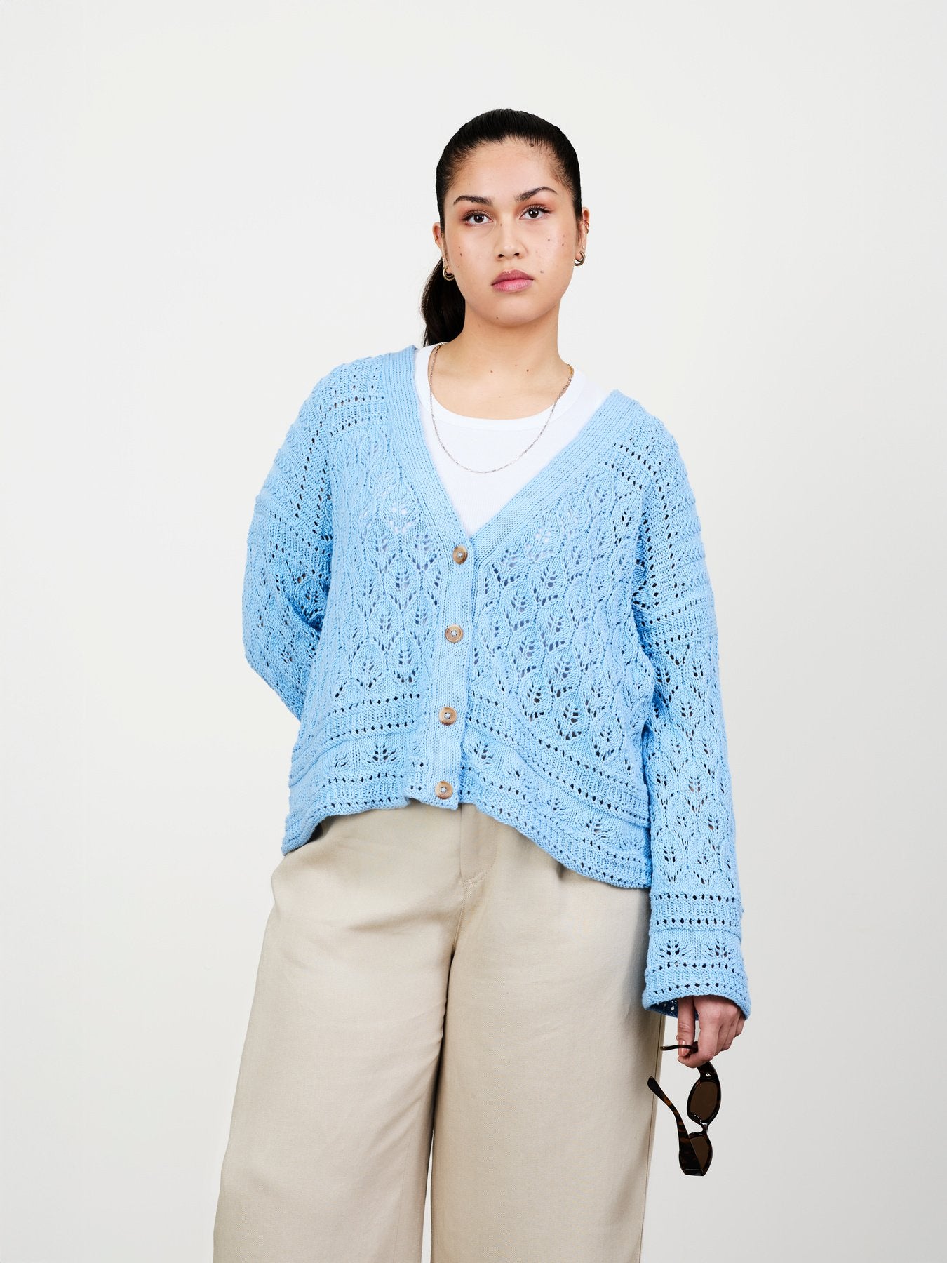 Jakken strikkes i Pandora fra Rauma Garn – et 100 % bomuldsgarn, der giver en blød og sval struktur, ideel til sommerbrug og sart hud.