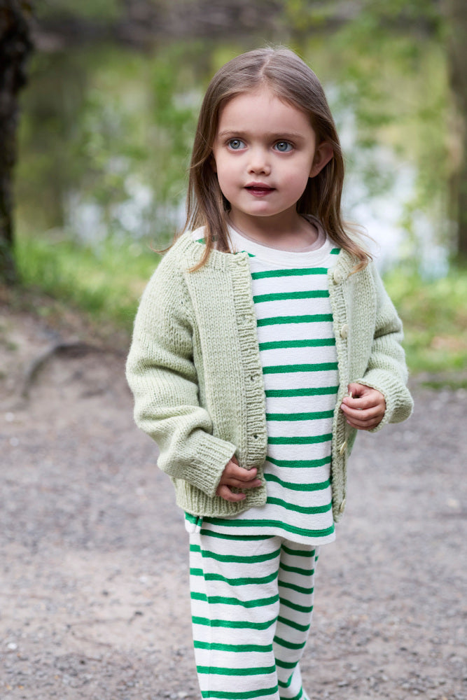 Jakken strikkes frem og tilbage, ovenfra og ned i glatstrik med klassisk pasform og ribkanter i 1x1. Konstruktionen starter ved halsen, hvor udtagninger formes med vendepinde samtidig med raglanudtagninger. Når raglanen er færdig, strikkes krop og ærmer hver for sig og afsluttes med rib. Til sidst samles masker op til knapstolper, som strikkes i rib – med knaphuller i den ene side og knapper i den anden.