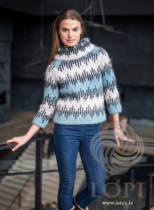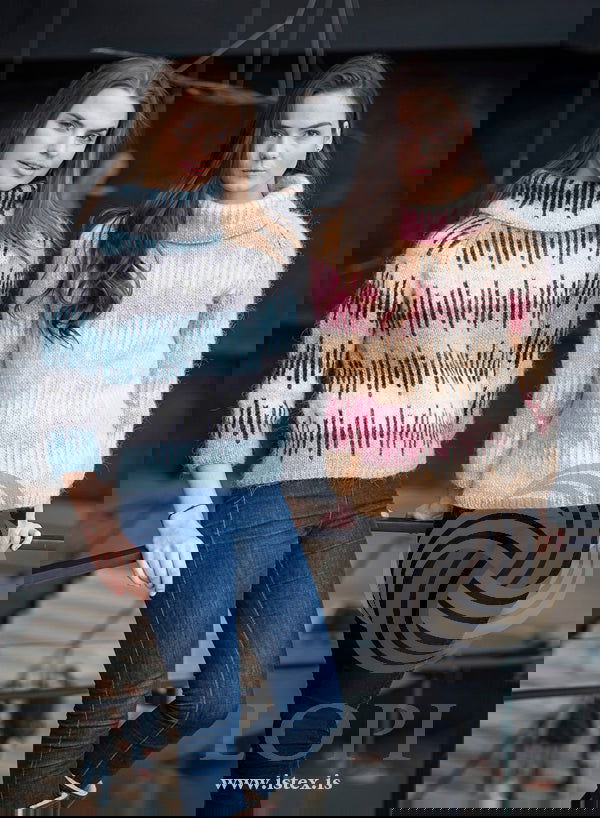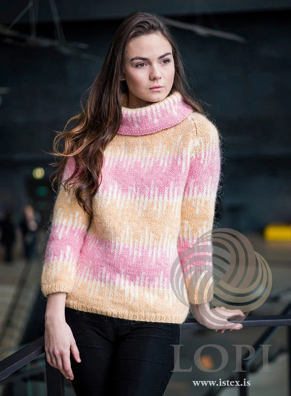 Birta betyder lys eller klarhed på islandsk, og det navn bærer denne sweater med stolthed. Designet skiller sig ud med sine utraditionelle farvekombinationer og korte, boxy pasform. Vælg mellem to markante versioner: gul og pink eller turkis og grå – begge strikket i varm og slidstærk Álafosslopi.
