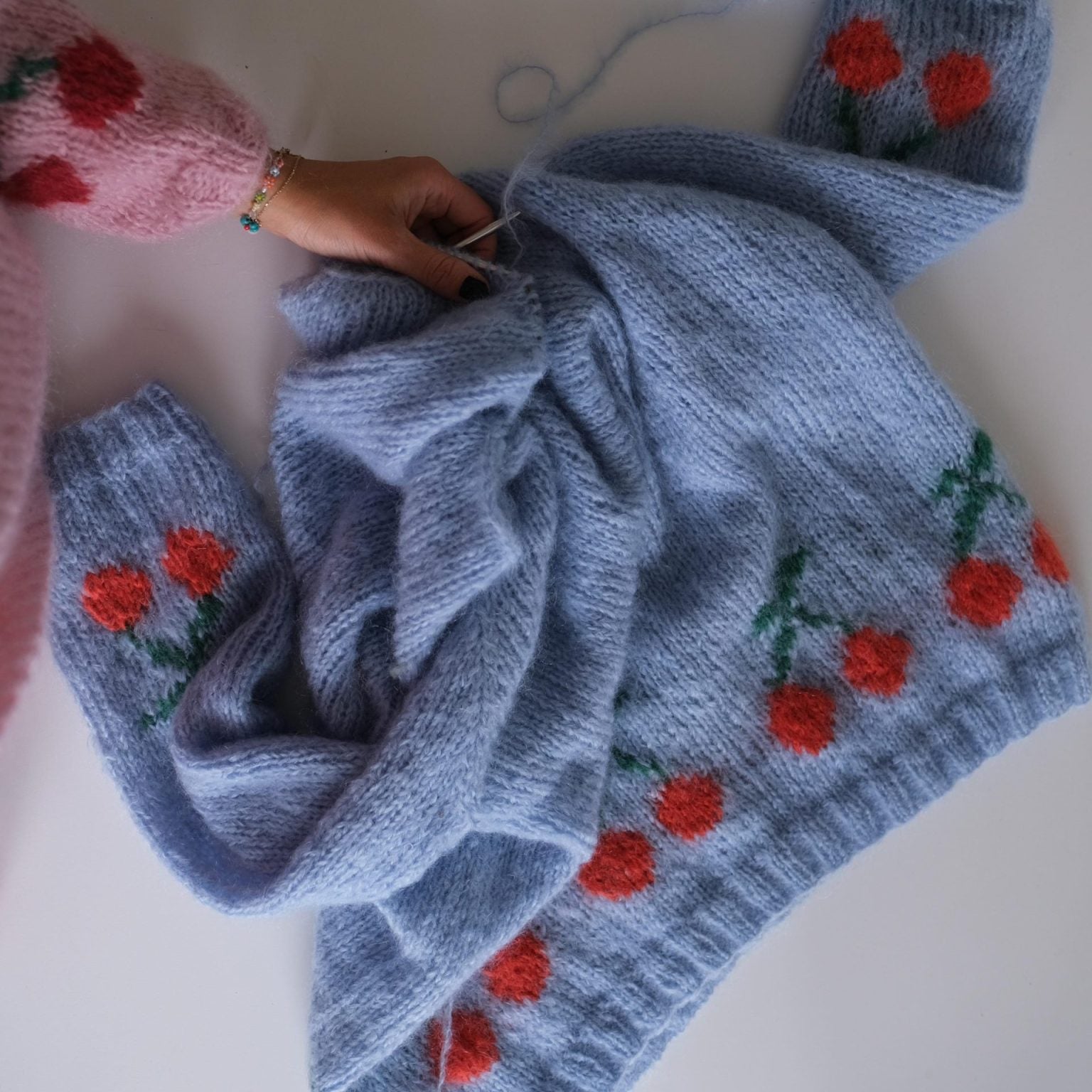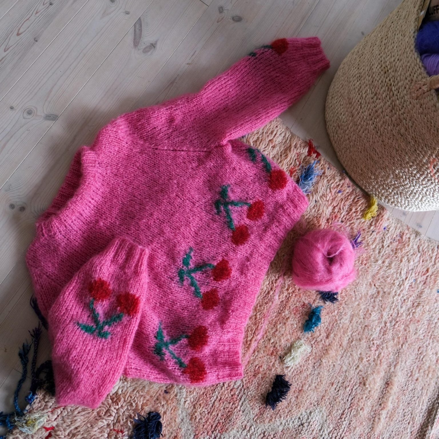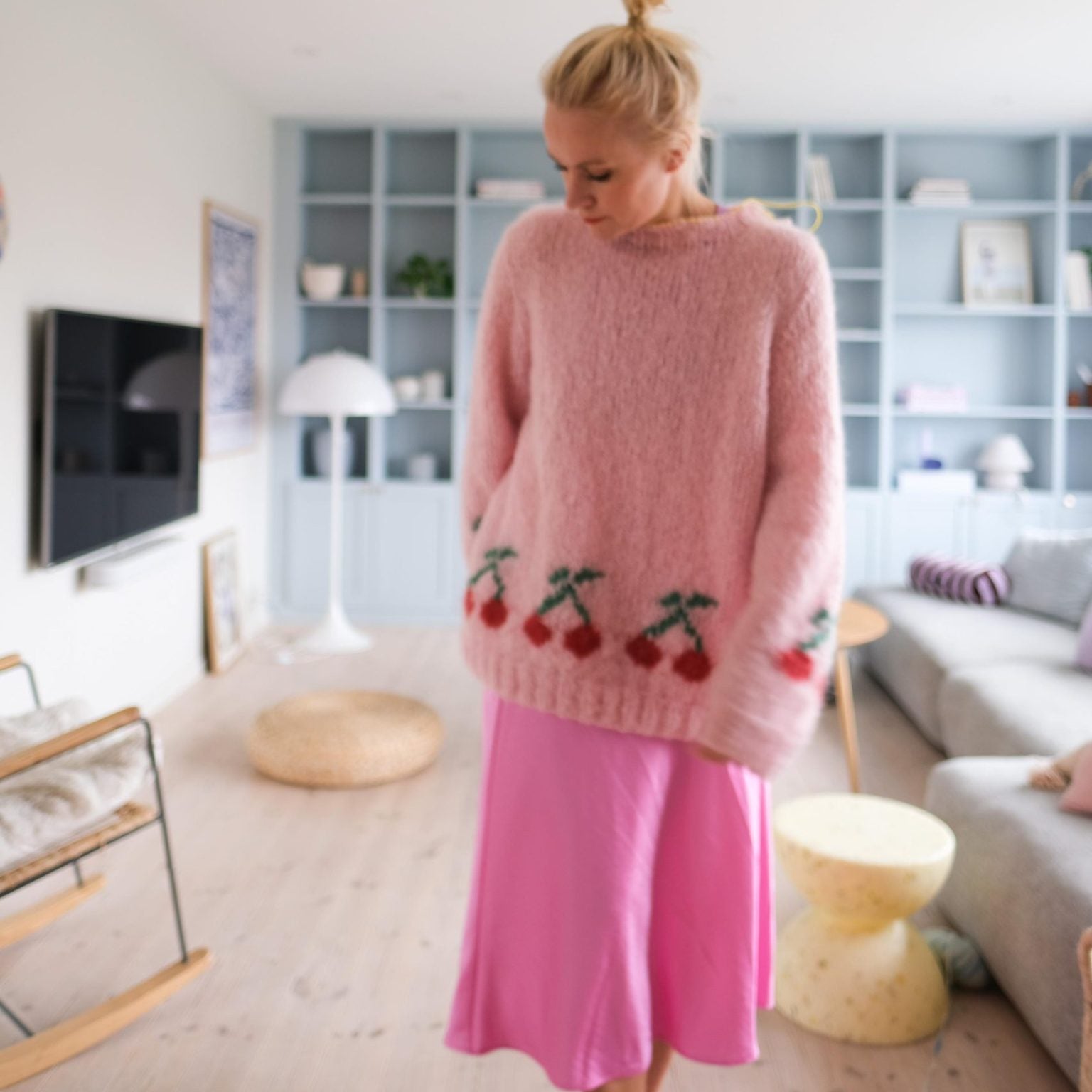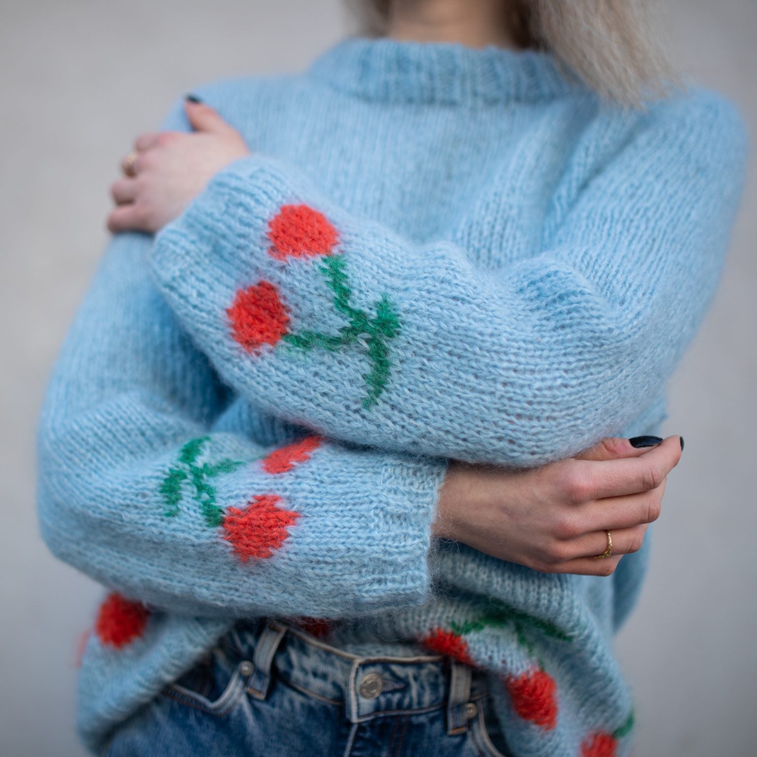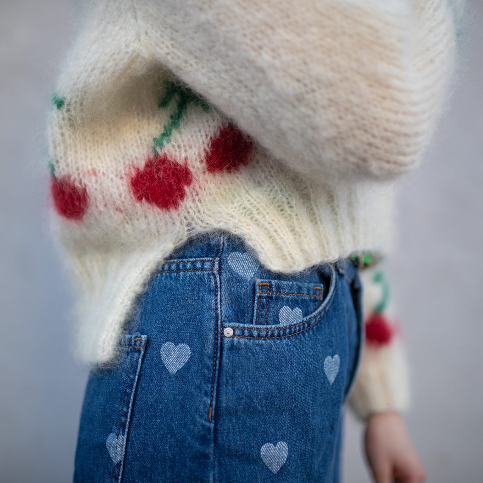 Kirsebærsweateren er en sød og stemningsfuld frugtsweater fra HipKnitShop, pyntet med små kirsebær langs taljen og ærmerne. Et feminint og legende design i blød, luftig mohair – enkel i udtrykket og nem at style.