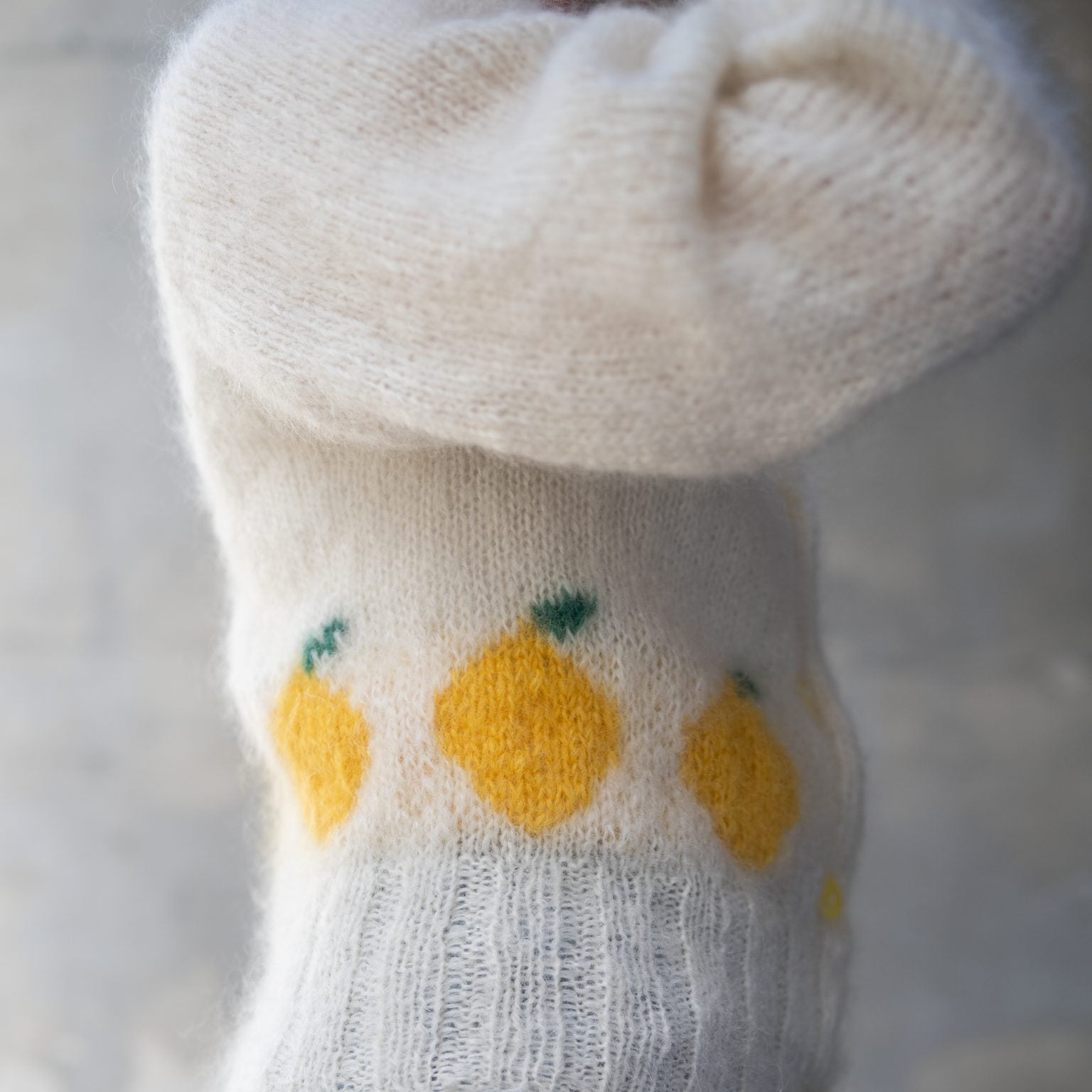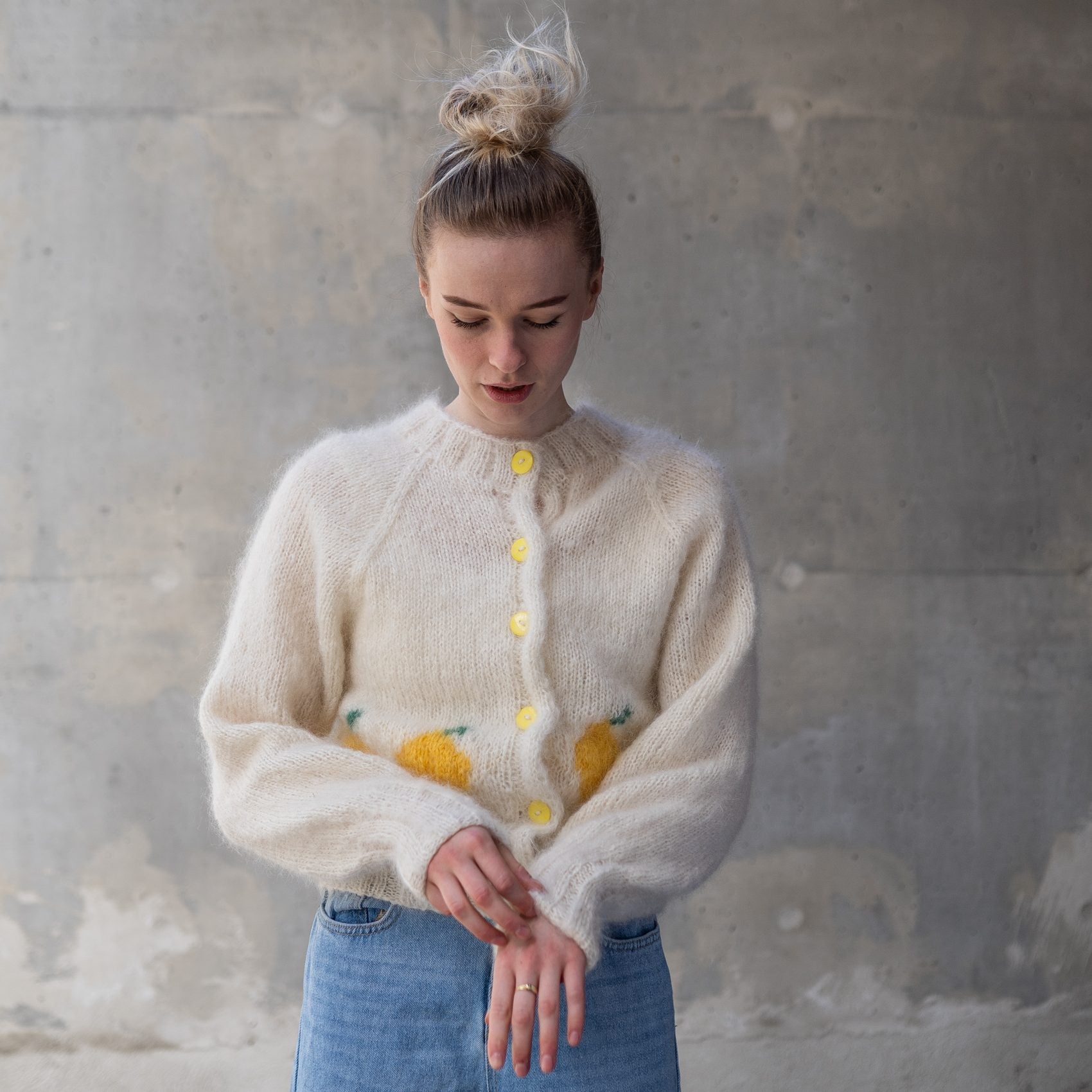 Citron Cardigan er en yndig og farverig cardigan med små frugter strikket ind langs ribkanten. Modellen har markante ribkanter, ballongærmer og en løs, rummelig pasform over kroppen, men sidder lidt tættere i ribkanterne for et feminint snit.