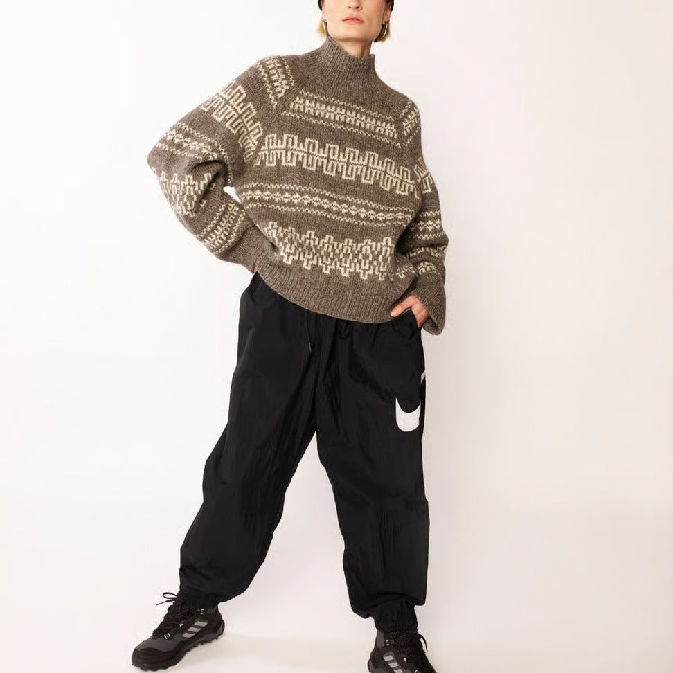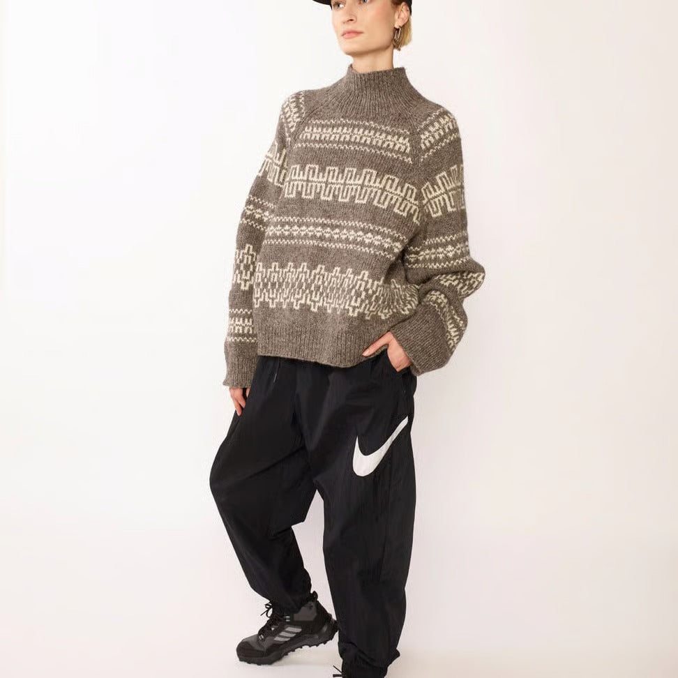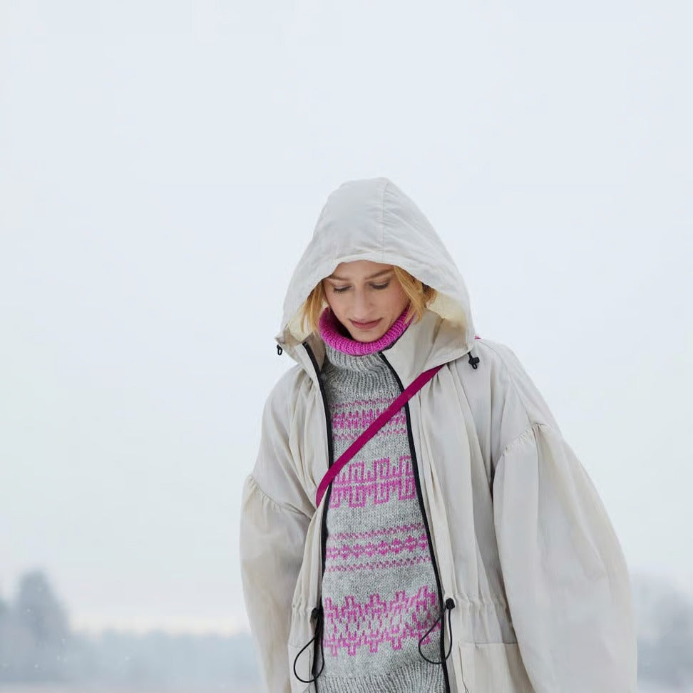 Fjære Genser er en smuk, klassisk og moderne sweater med mønsterstrik i to farver, en oversized pasform og elegant raglankonstruktion. Den strikkes ovenfra og ned, så du let kan tilpasse længderne undervejs.