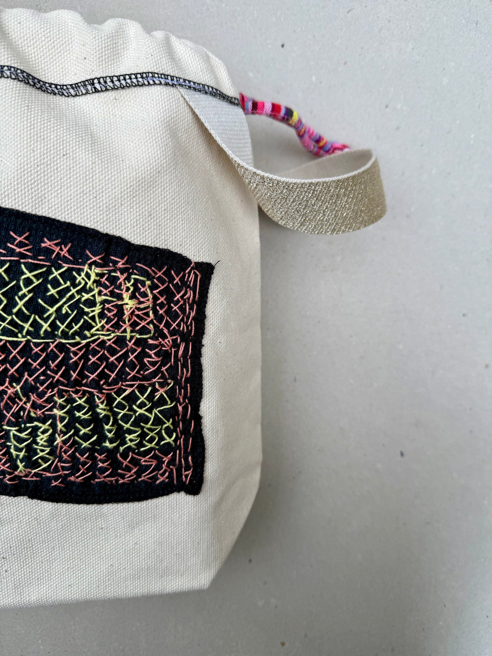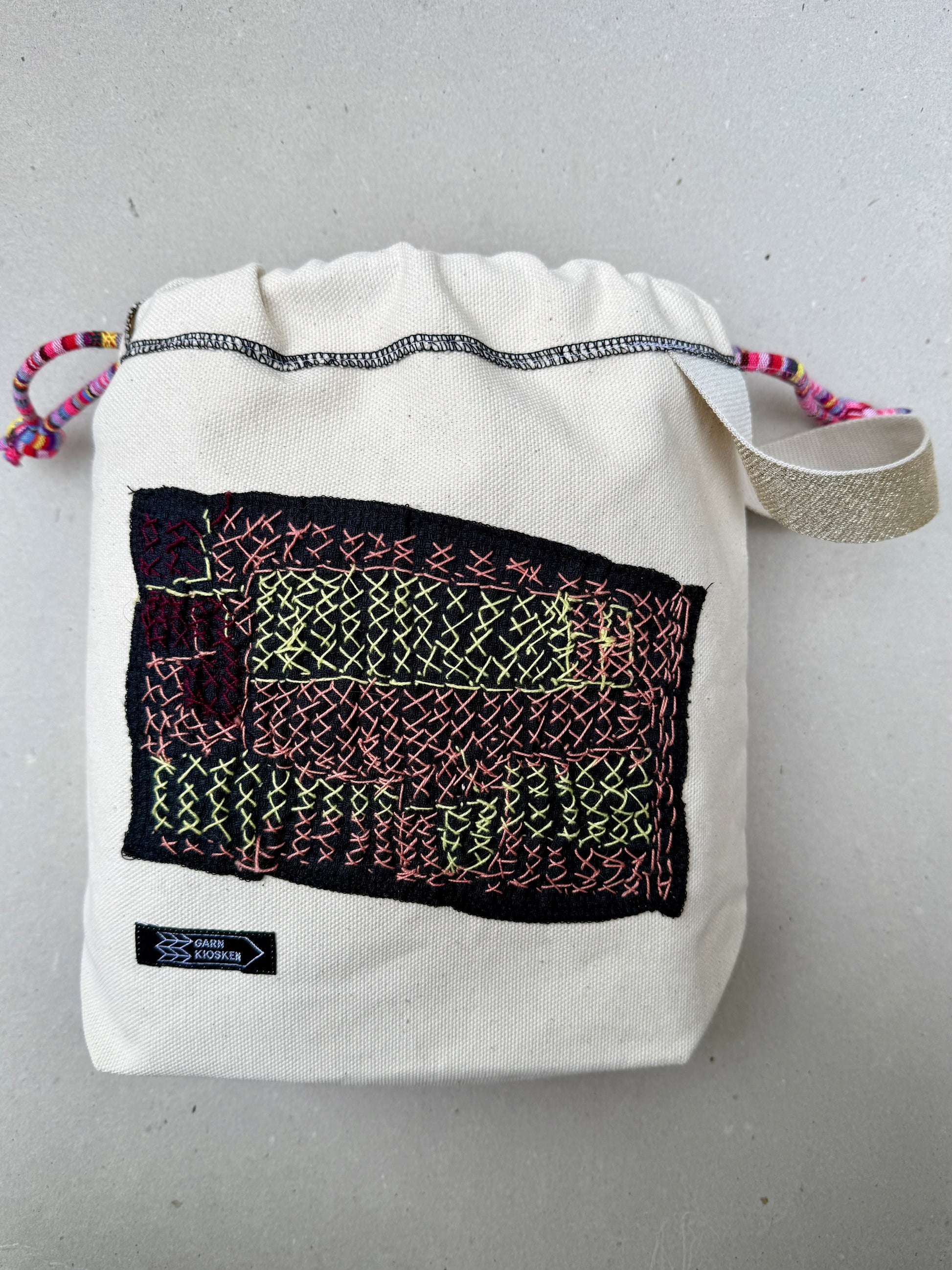 Hver taske er håndlavet og helt sin egen, med et originalt lille kunstværk på forsiden og en praktisk lomme indvendigt. Taskerne er syet i kraftigt og slidstærkt lærred, der gør dem ideelle til strikke- og hækleprojekter – eller som en særlig hverdags- eller gavepose.