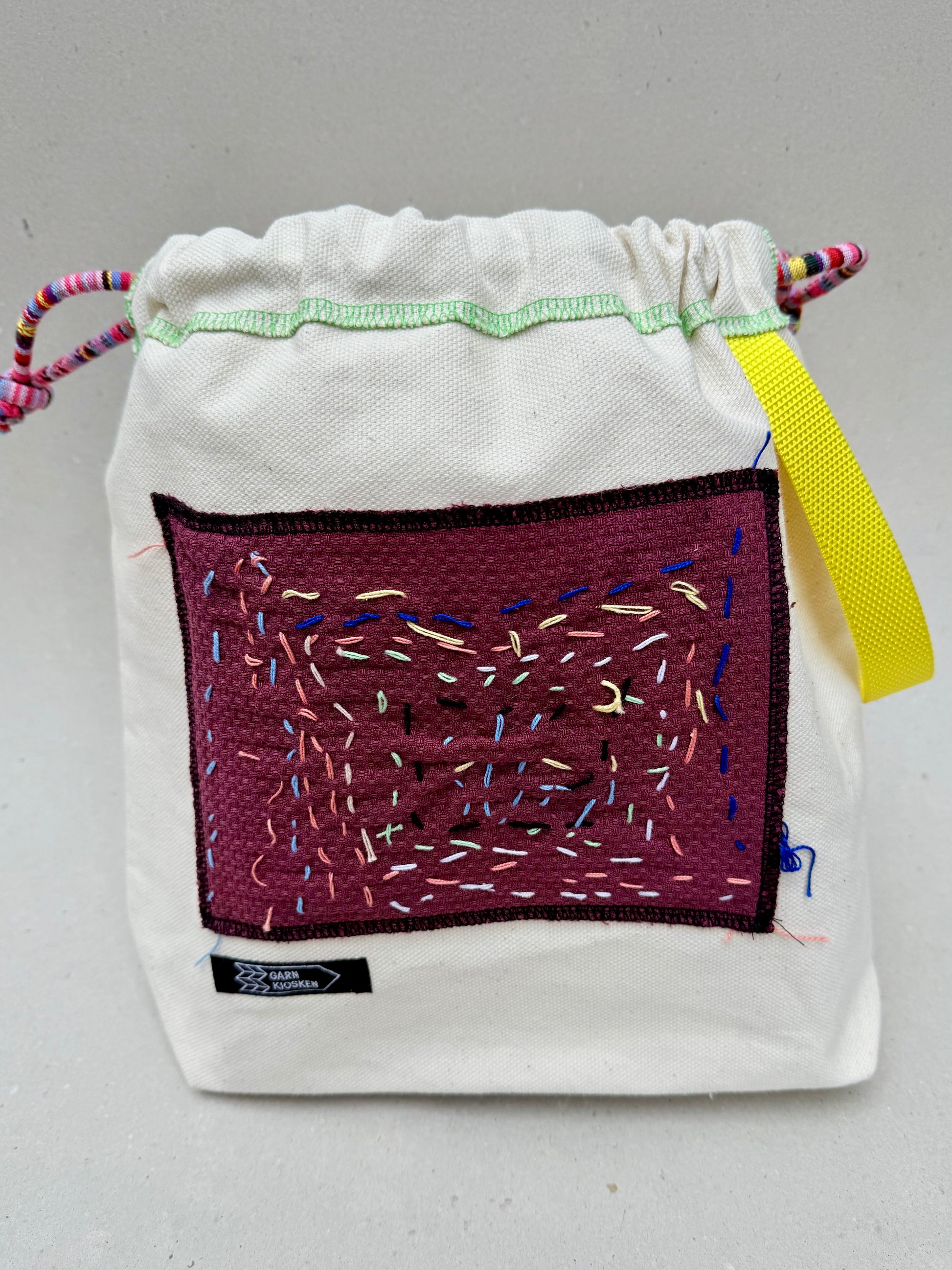 Hver taske er håndlavet og helt sin egen, med et originalt lille kunstværk på forsiden og en praktisk lomme indvendigt. Taskerne er syet i kraftigt og slidstærkt lærred, der gør dem ideelle til strikke- og hækleprojekter – eller som en særlig hverdags- eller gavepose.