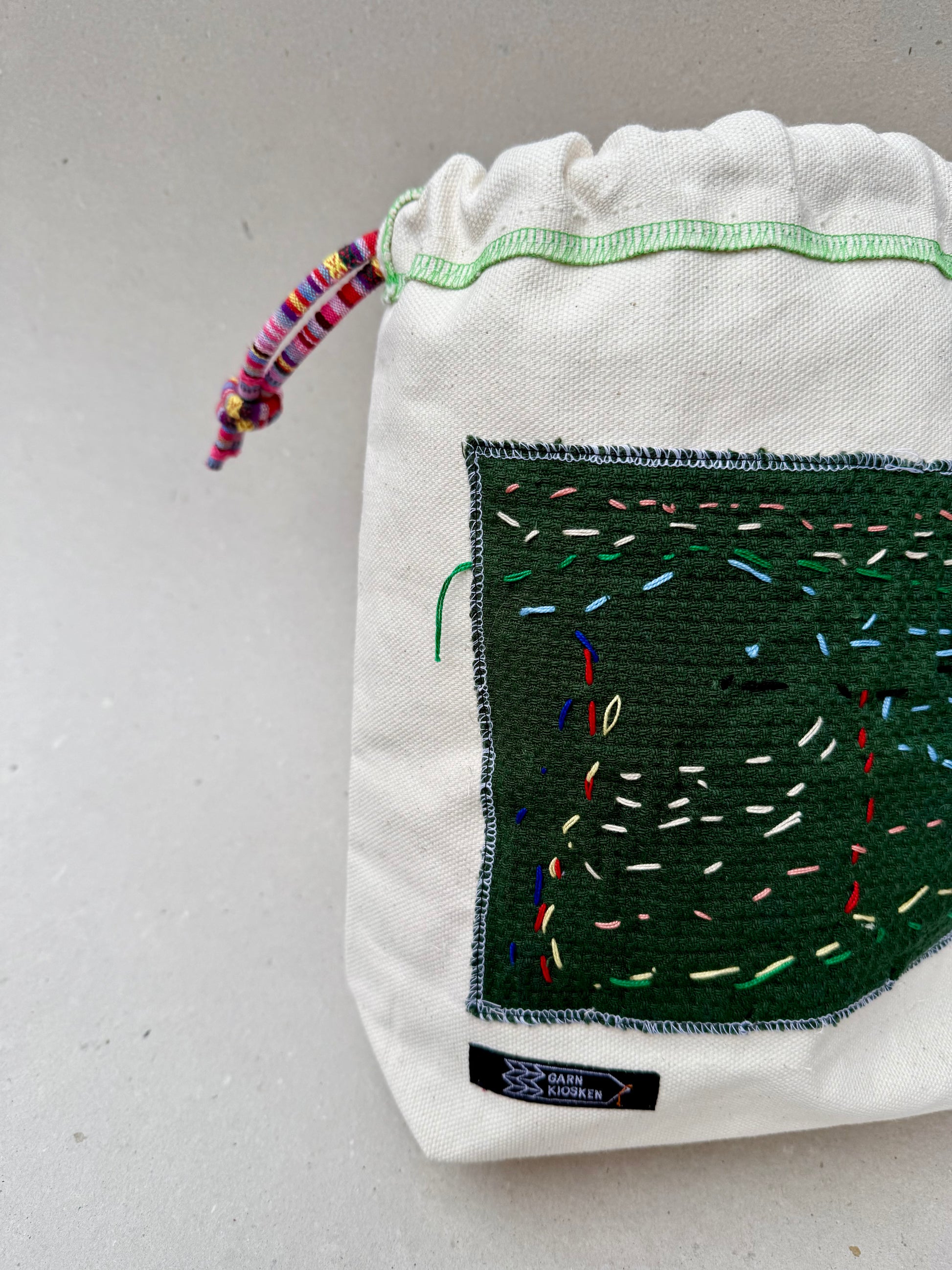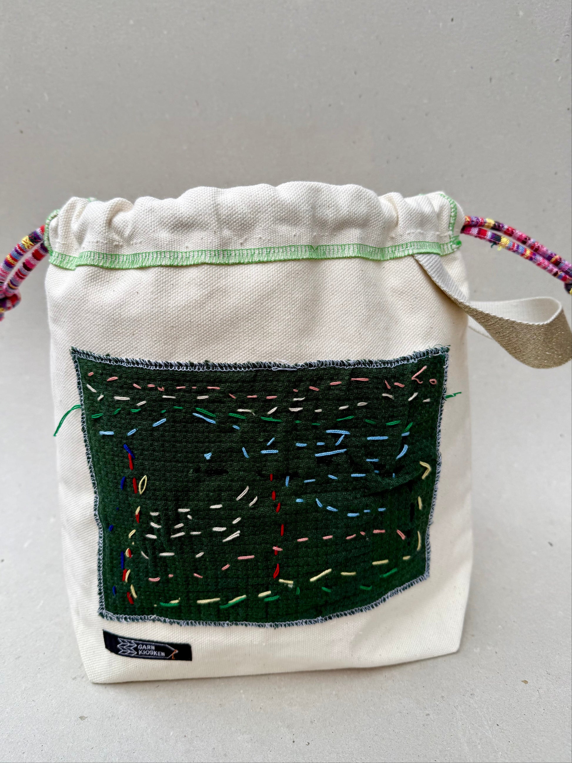Hver taske er håndlavet og helt sin egen, med et originalt lille kunstværk på forsiden og en praktisk lomme indvendigt. Taskerne er syet i kraftigt og slidstærkt lærred, der gør dem ideelle til strikke- og hækleprojekter – eller som en særlig hverdags- eller gavepose.
