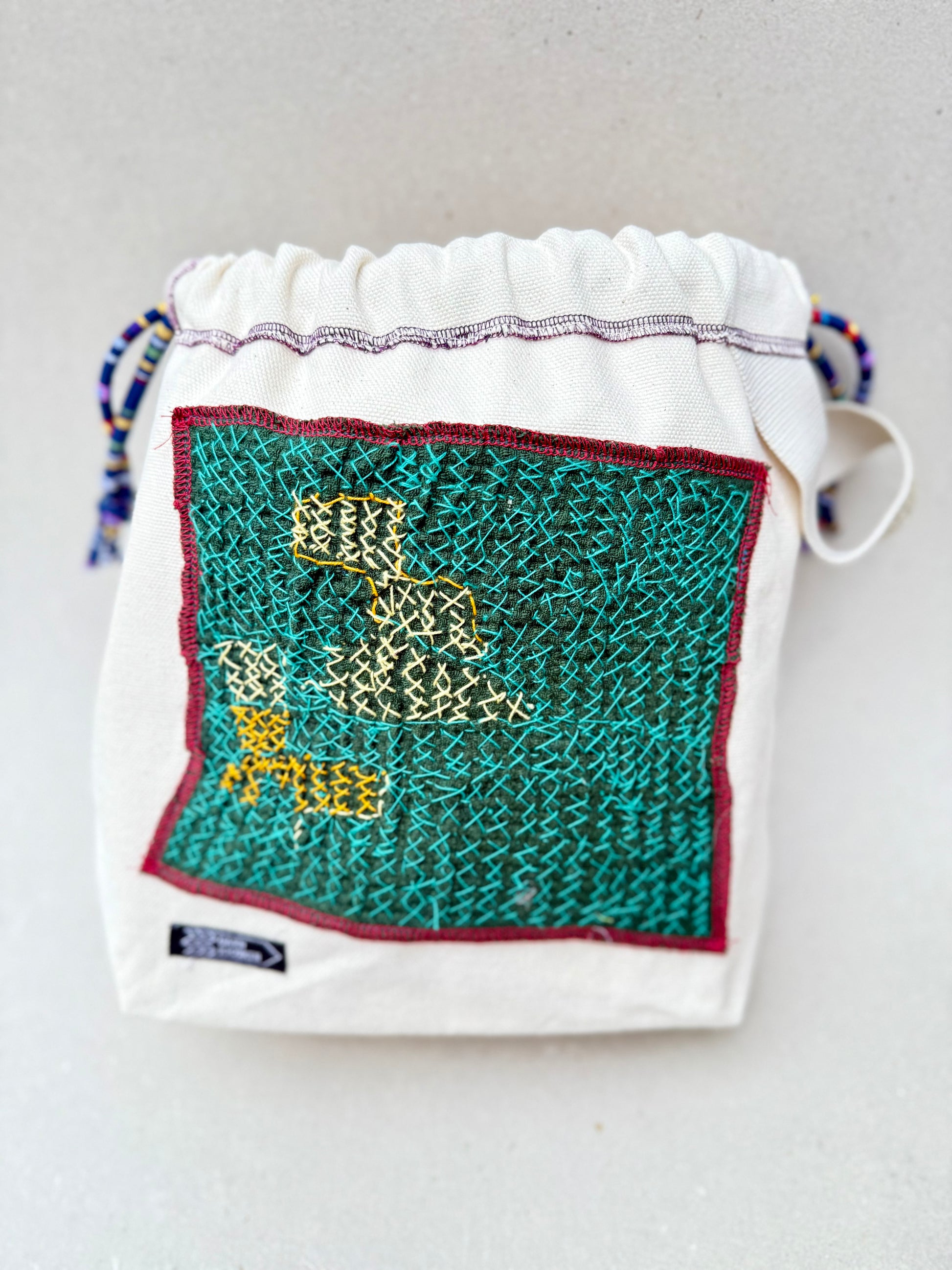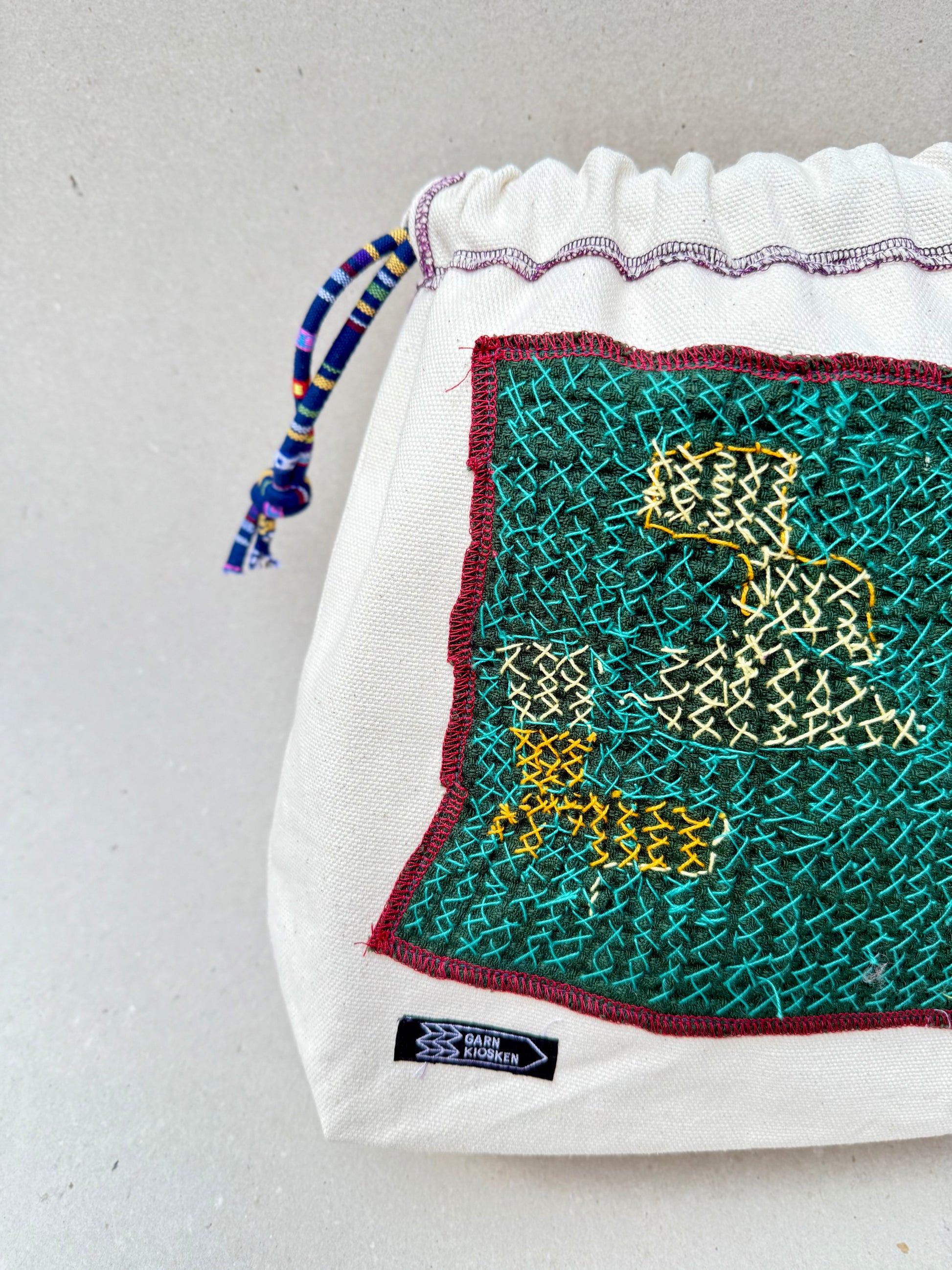 Hver taske er håndlavet og helt sin egen, med et originalt lille kunstværk på forsiden og en praktisk lomme indvendigt. Taskerne er syet i kraftigt og slidstærkt lærred, der gør dem ideelle til strikke- og hækleprojekter – eller som en særlig hverdags- eller gavepose.
