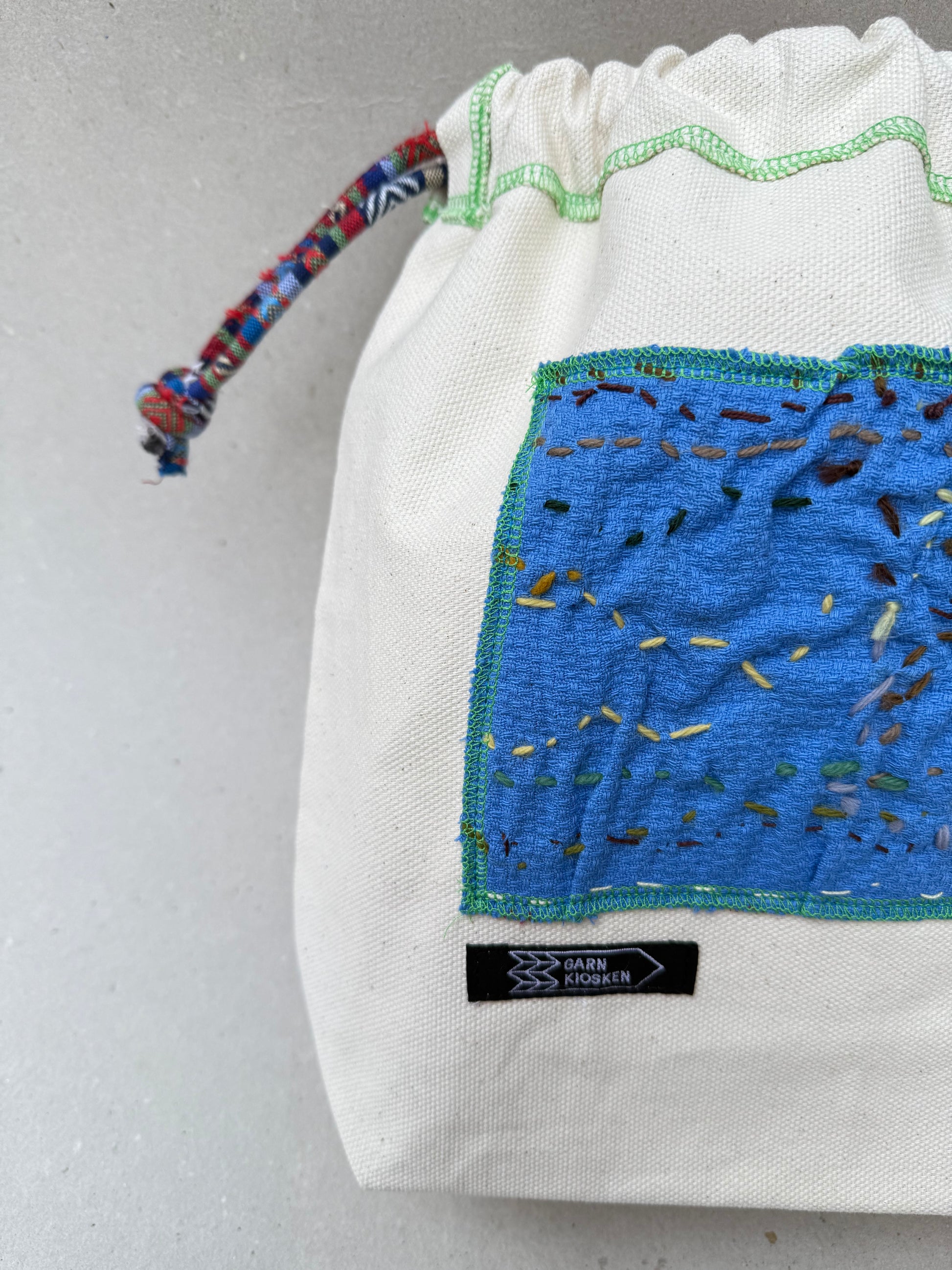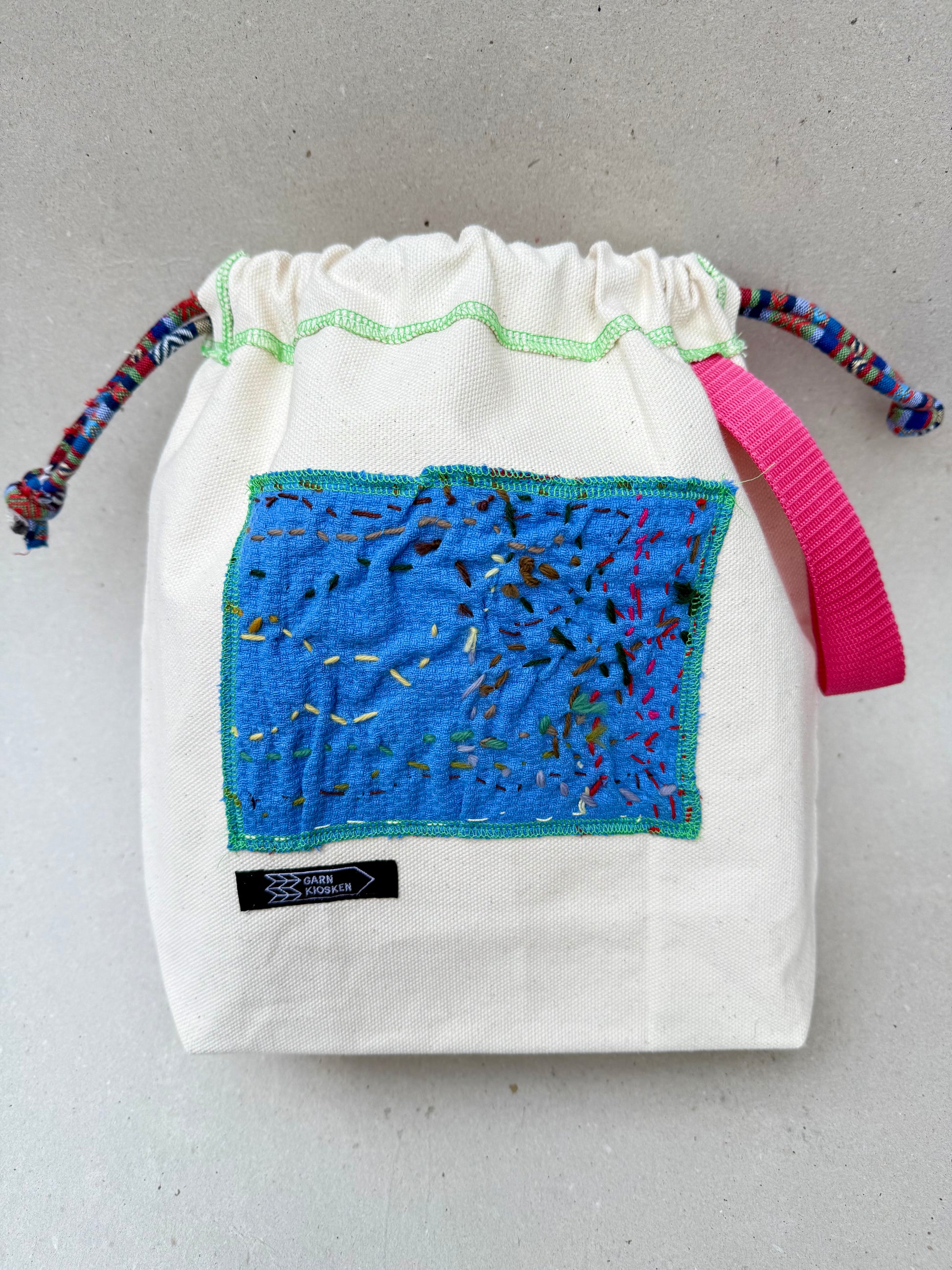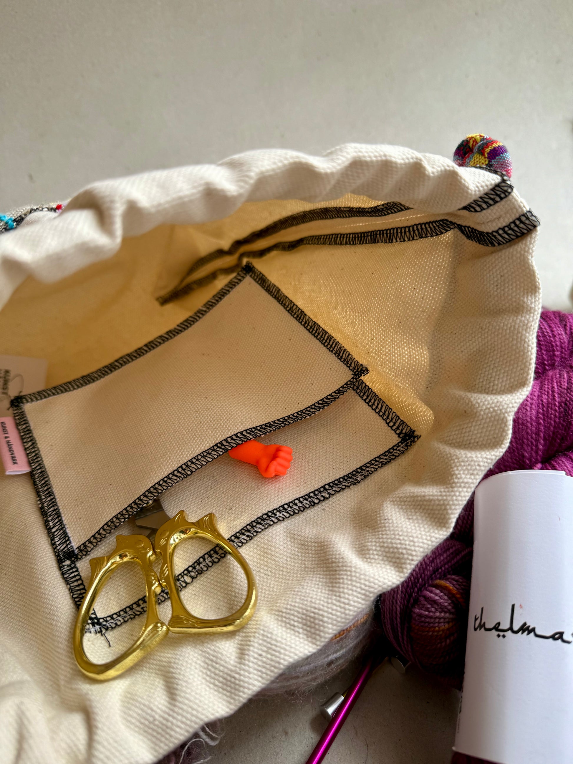 Hver taske er håndlavet og helt sin egen, med et originalt lille kunstværk på forsiden og en praktisk lomme indvendigt. Taskerne er syet i kraftigt og slidstærkt lærred, der gør dem ideelle til strikke- og hækleprojekter – eller som en særlig hverdags- eller gavepose.