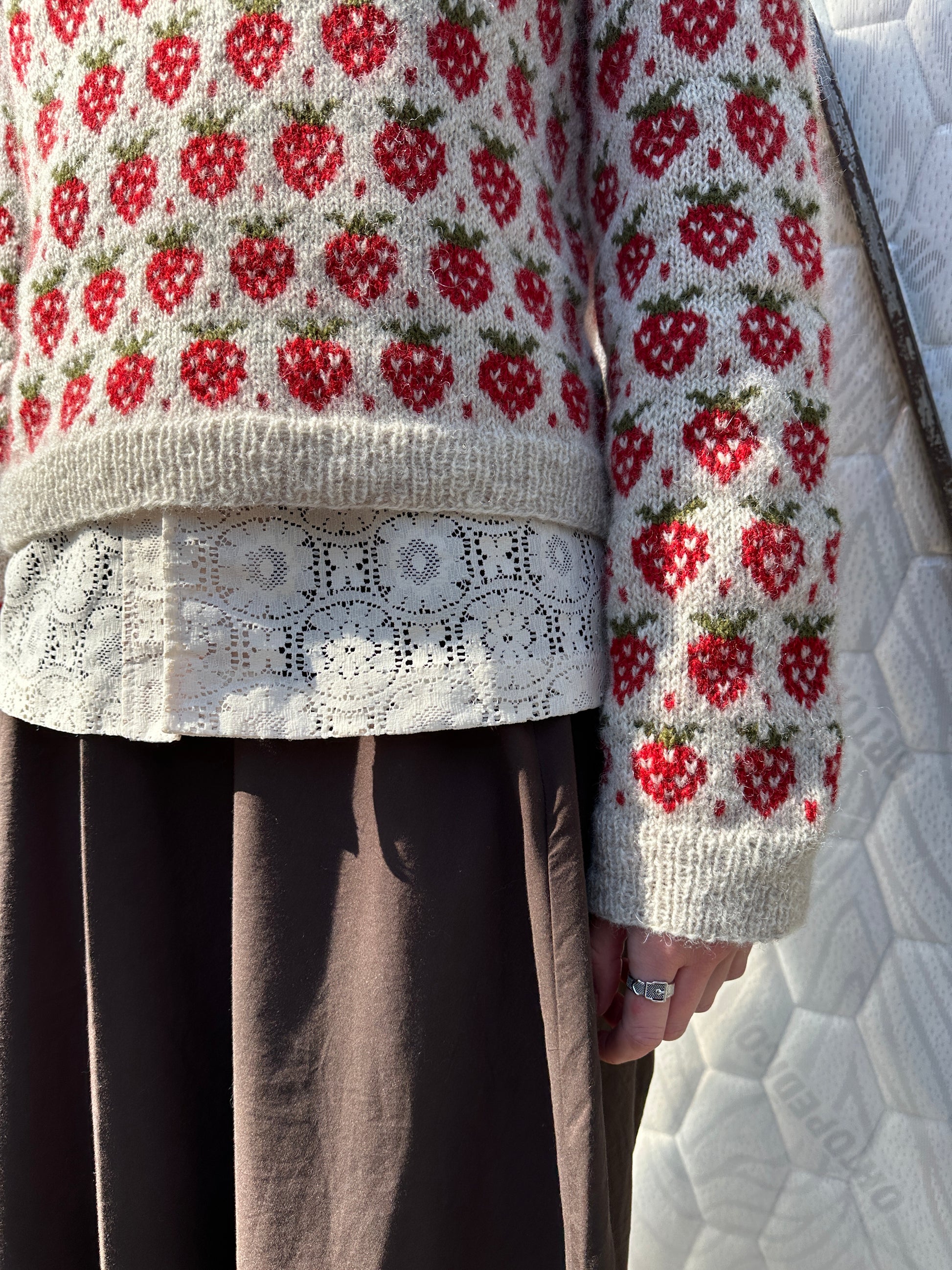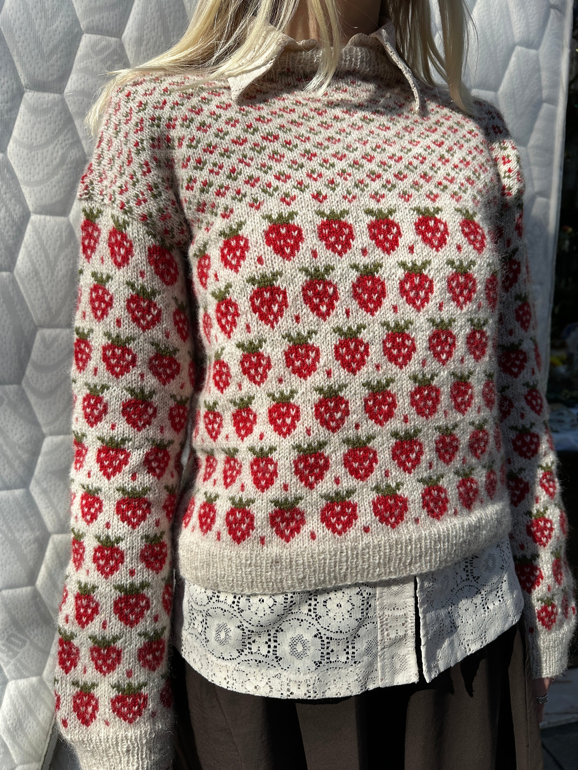 Pomona Sweater strikkes rundt nedefra og op i flerfarvestrik efter diagram. Først strikkes kroppen, så ærmerne. Ærmegab klippes op efter syning med symaskine. Skuldermaskerne sys sammen, halskanten strikkes, og ærmerne sys i til sidst. Sweateren har et bevægelsesrum på ca. 15 cm.