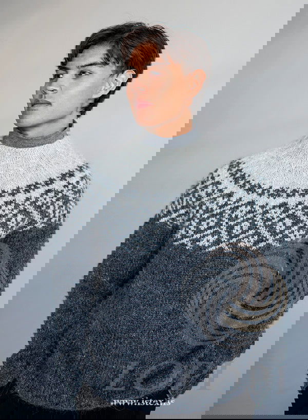 Den strikkes i Plötulopi (100 g plader) fra Ístex – det uspundne islandske uldgarn. Her bruges garnet med 2 tråde, hvilket giver en let, men varm sweater med et smukt, levende maskebillede.
