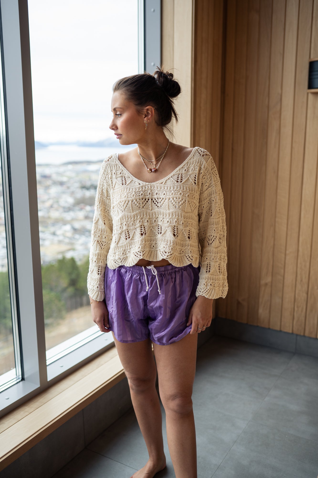 Sweateren har en kort og rummelig pasform. Den viste model er strikket i farven Popcorn Cuddle Me Cotton i størrelse L. Modellen på billedet er 169 cm høj og bærer størrelse S/M.