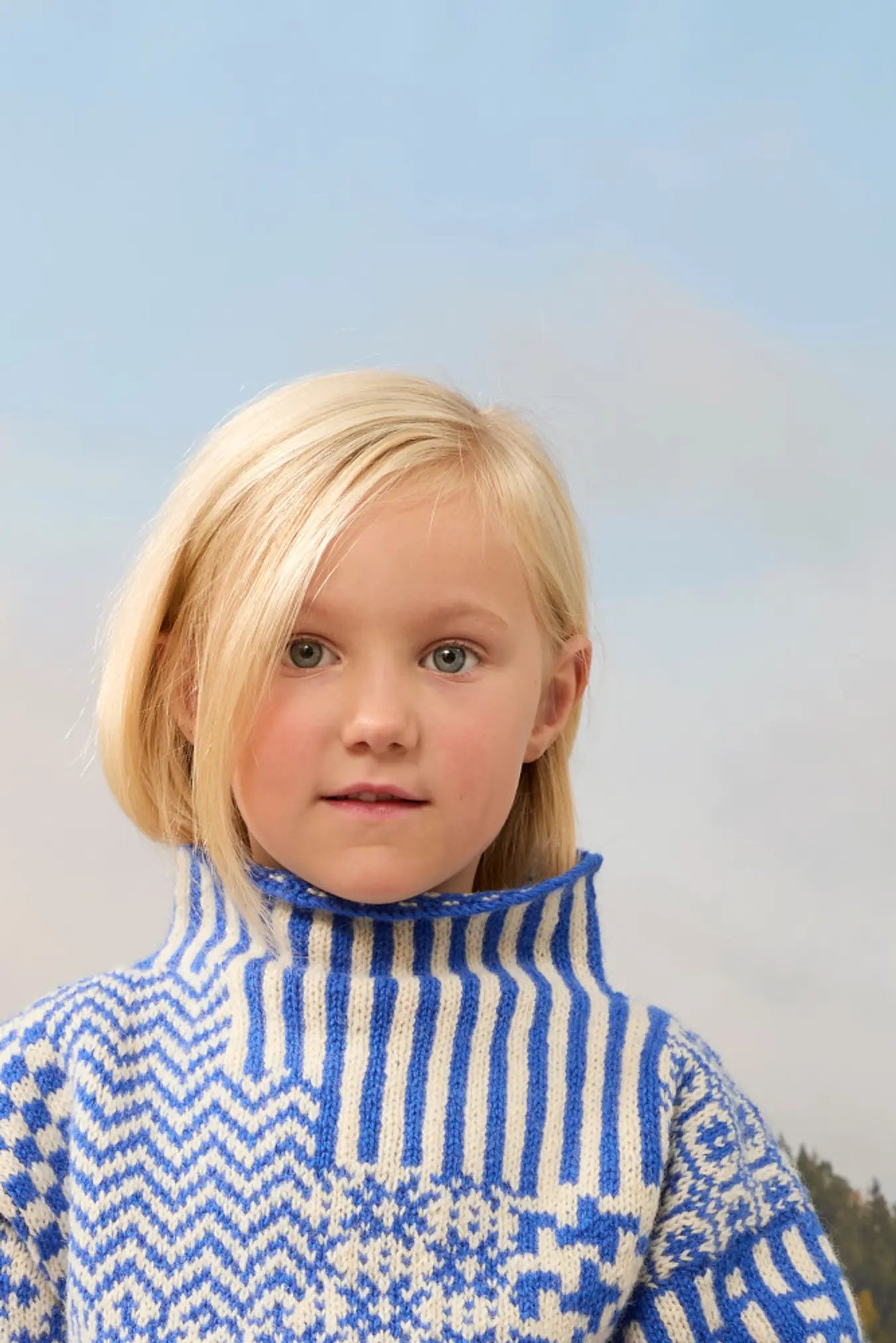 Sweateren strikkes i Rauma Finull – et let og slidstærkt garn i 100 % norsk uld – hvilket gør den ideel til aktive børn.