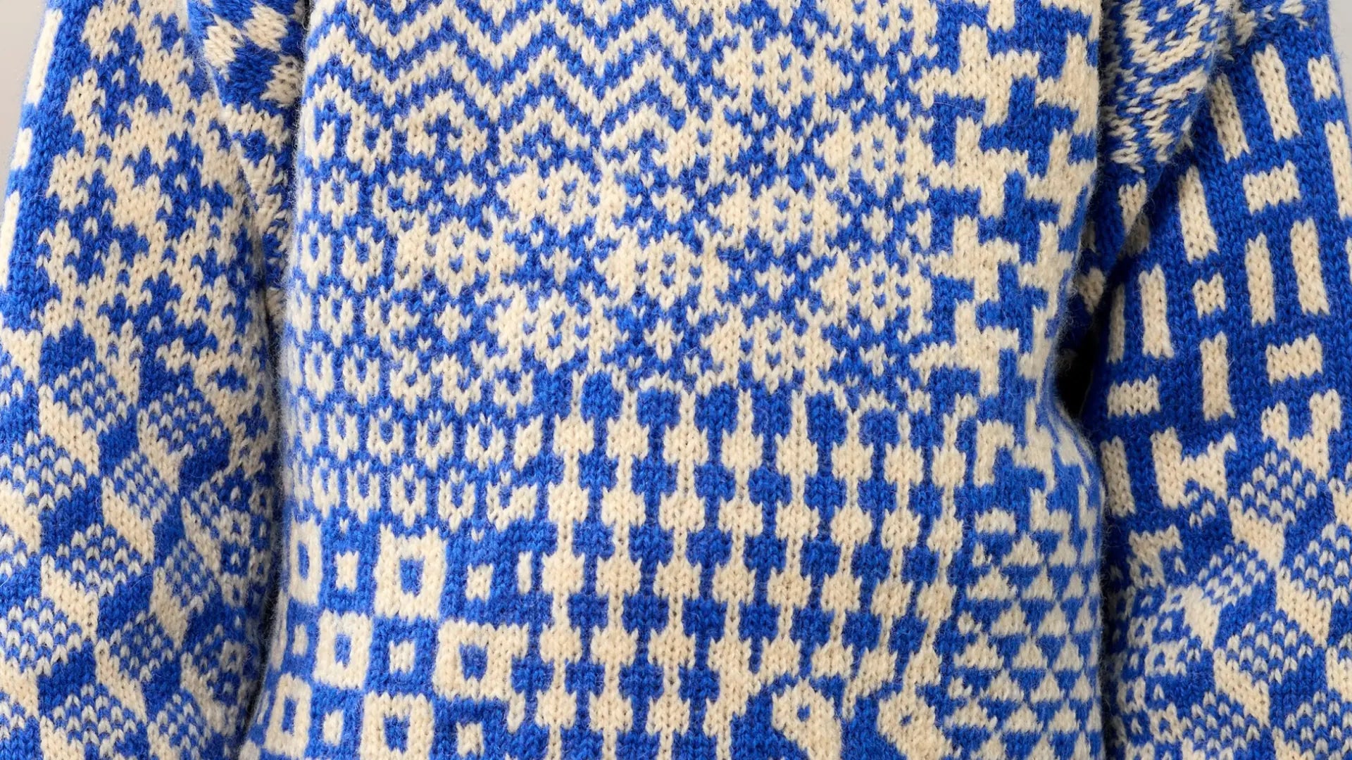 Sweateren har en lige pasform med rå kanter uden rib, hvilket giver et enkelt og grafisk udtryk. Den strikkes rundt nedefra og op i mønsterstrik efter diagram. Skuldrene formes ved at lukke af hver anden maske fra for- og bagstykket. Derefter samles masker op til halskanten, som strikkes rundt.