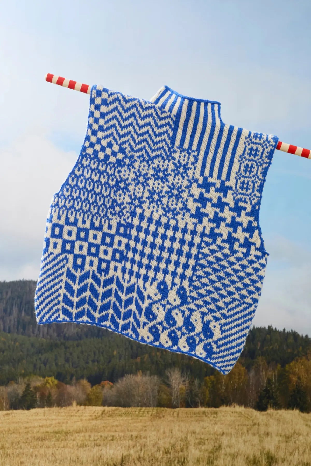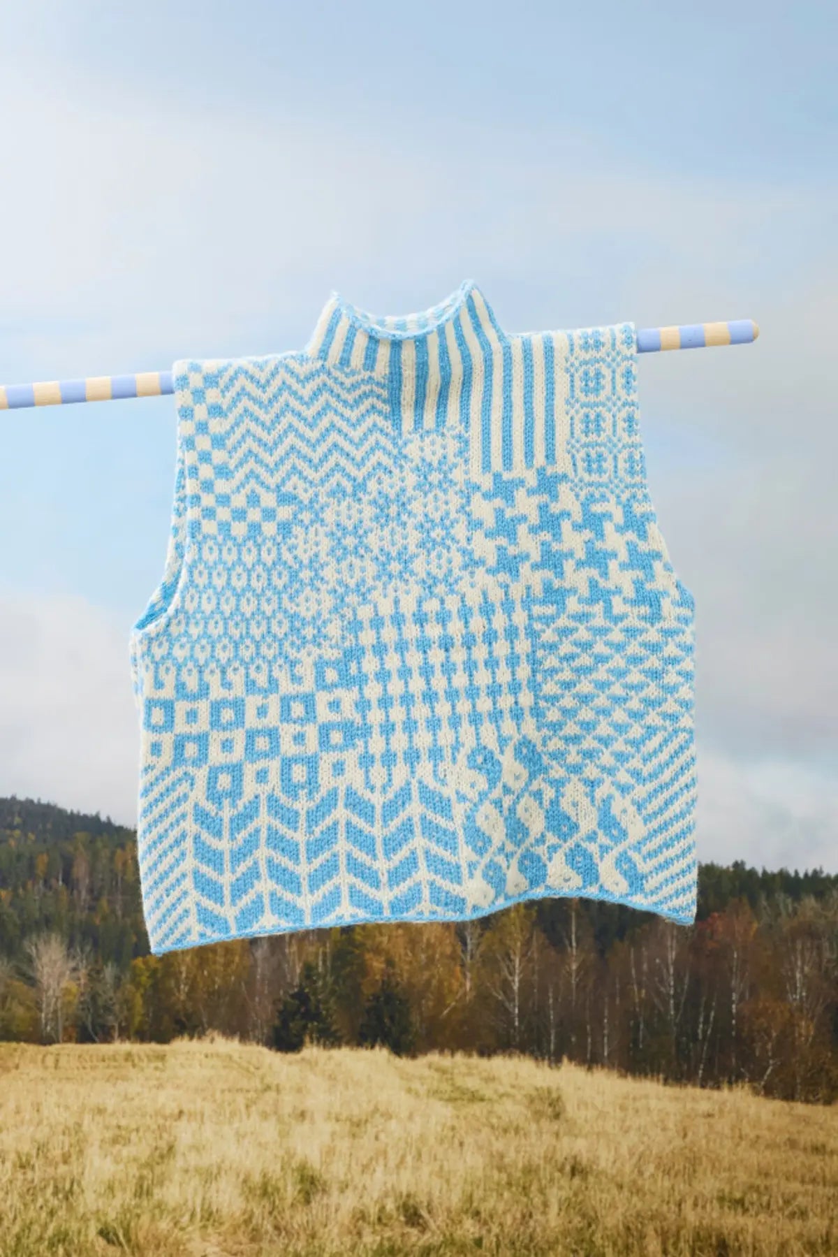 En forskel fra trøjen er, at vesten har formede ærmegab for en god pasform over skuldrene. Nordic Mix Vest strikkes rundt, nedefra og op efter diagram. Skuldrene strikkes sammen ved at lukke af hver anden maske fra for- og bagstykket. Derefter samles masker op til halsen, som strikkes rundt.