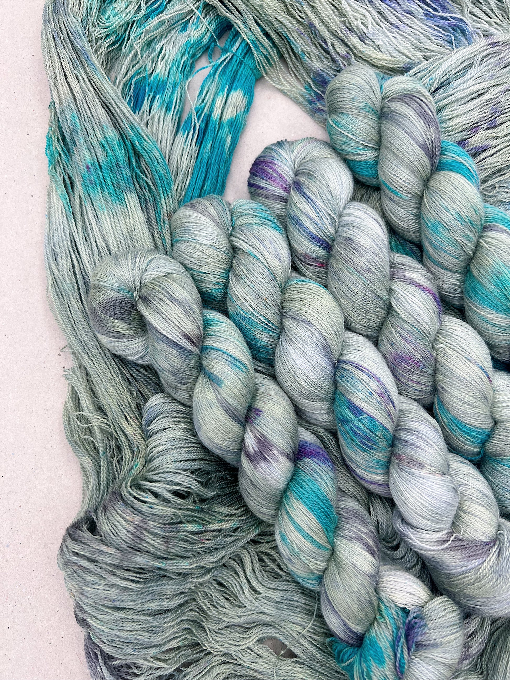 Hvert fed Angel Lace er håndfarvet af Thelma Steimann, hvilket gør hver eneste farve unik. Kvaliteten bruges ofte som følgetråd for at give strikketøjet et håndfarvet og personligt præg. Prøv at kombinere den med silk mohair, bomuld eller pladegarn – mulighederne er uendelige. Den er også meget populær som gave, da den kan bruges på utallige kreative måder.