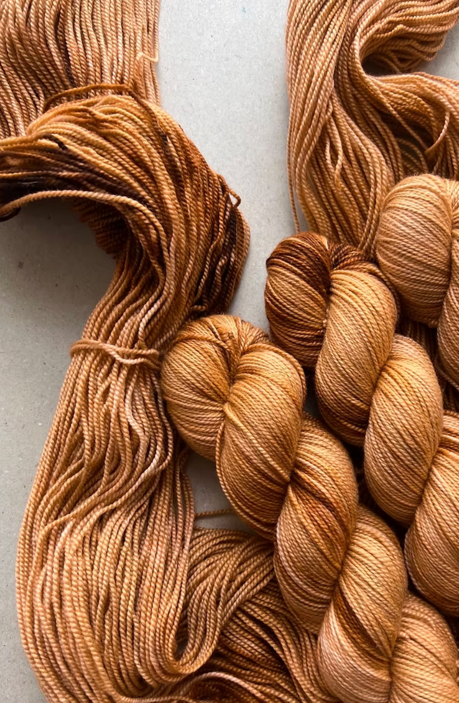 Da garnet er håndfarvet er intet fed ens, selvom garnet kommer fra samme indfarvning. Hvis du fortrækker et mere ensartet resultat anbefaler vi at du strikker striber af af de forskellige fed.
