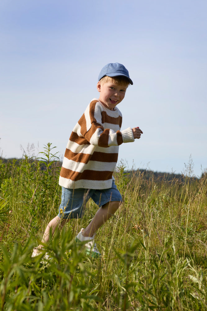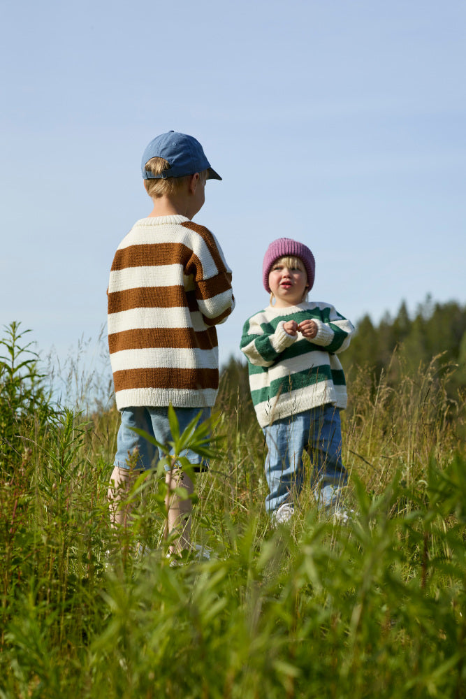 Tobbe sweater er en blød og oversize børnesweater med brede striber i to farver og kanter i 1x1 rib. Sweateren har lige skulder, rund hals og ekstra lange ribkanter på ærmerne, som foldes dobbelt, så de sidder godt om håndleddet. Den strikkes i Rauma Babygarn, et superwash-behandlet merinouldsgarn, der gør trøjen både blød og praktisk til børn.